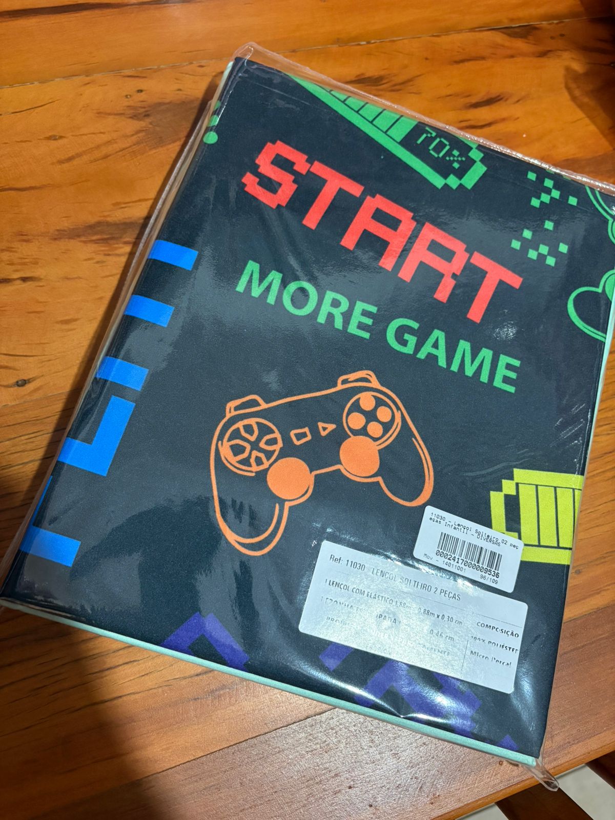 Conjunto prático para o quarto infantil com estampa temática de games, ideal para renovar o ambiente dos pequenos com conforto.
