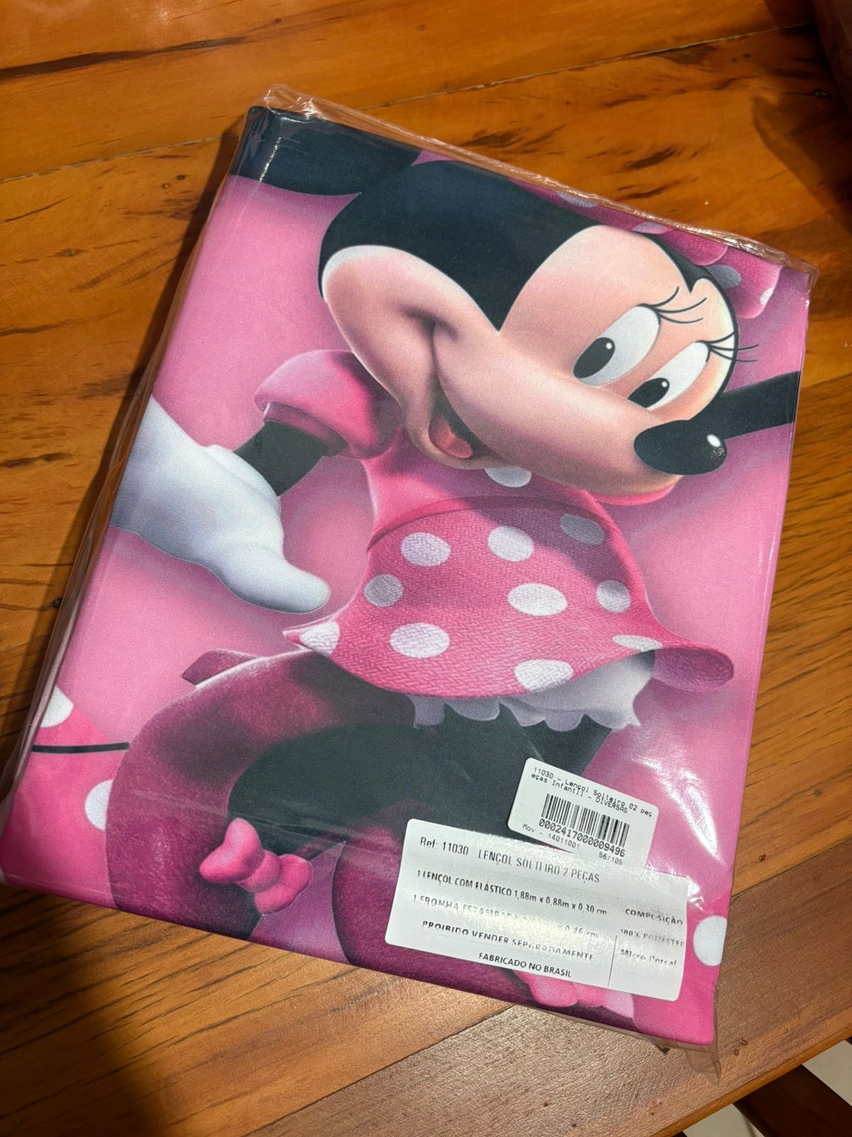 Este jogo inclui 1 lençol elástico e 1 fronha com estampa da Minnie, totalizando 2 peças.