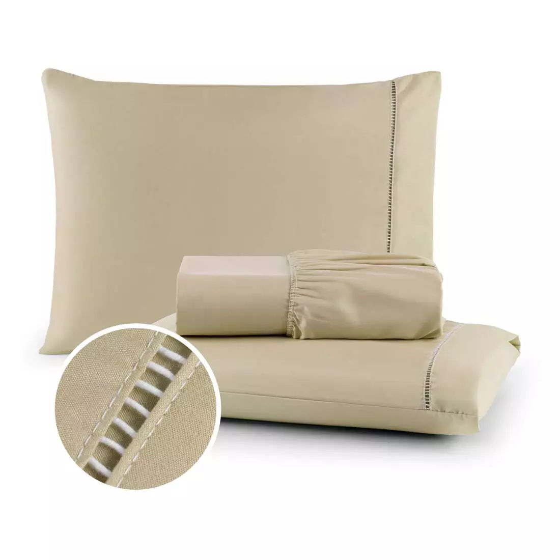 O jogo é confeccionado em tecido com trama fina e resistente, ideal para manter o frescor e o conforto na cama. O lençol elástico facilita a arrumação e o acabamento ponto palito traz um toque sofisticado, valorizando a decoração do seu dormitório.